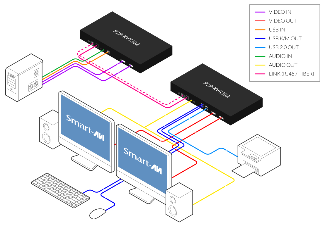 The P2P-KVR302 is a receiver unit designed to extend dual-head DVI video, USB 2.0, analog audio and RS-232 signals over CAT5 (or fiber) links. It supports selectable operation modes including point-to-point (direct), matrix switching, and centralized gateway mode (SaviGate) via a web interface.