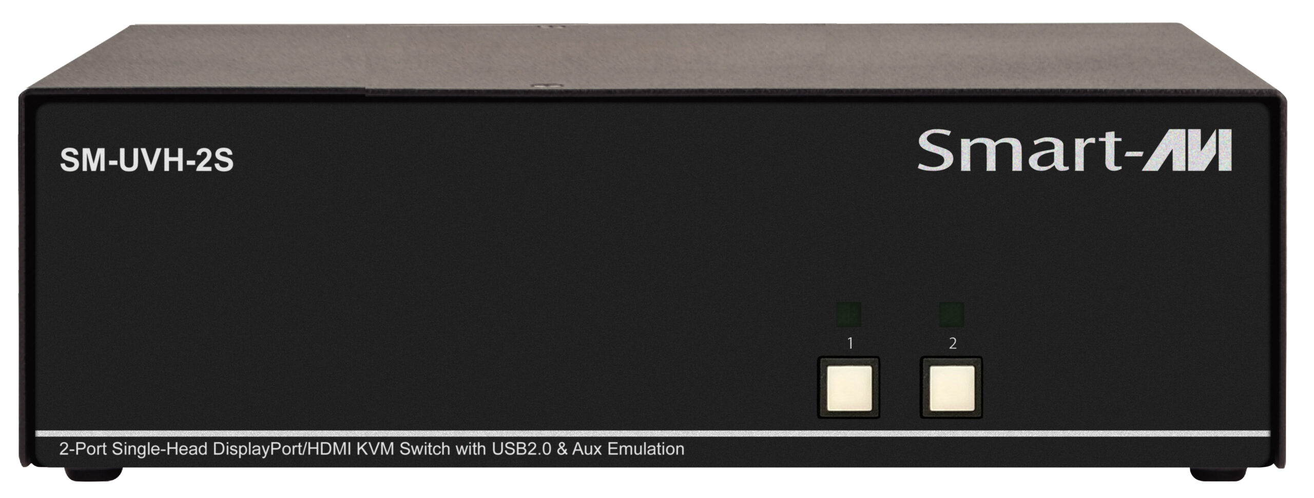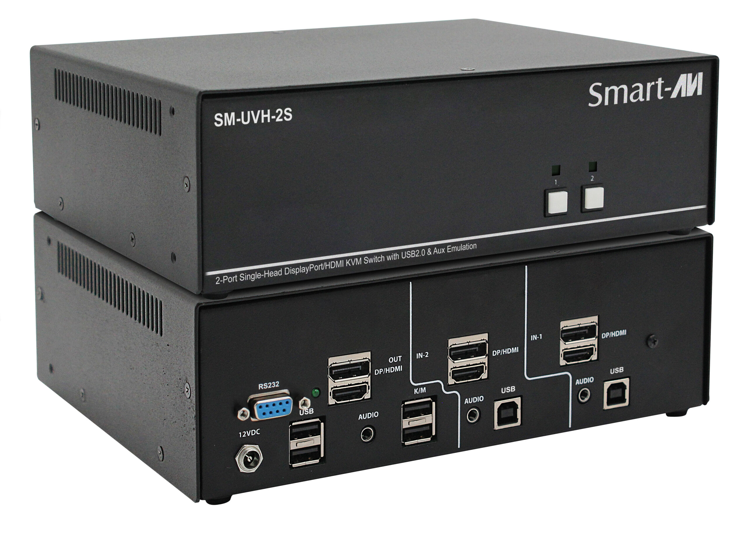 2-Port | Dual-Head | DP & HDMI KVM Switch | USB 2.0 & AUX Emulation The SM-UVH-2D is a dedicated multi-platform KVM Switch capable of managing up to 2 different computers through two monitors, USB keyboard and mouse, a set of speakers and USB devices like printers, memory devices, scanners, etc.