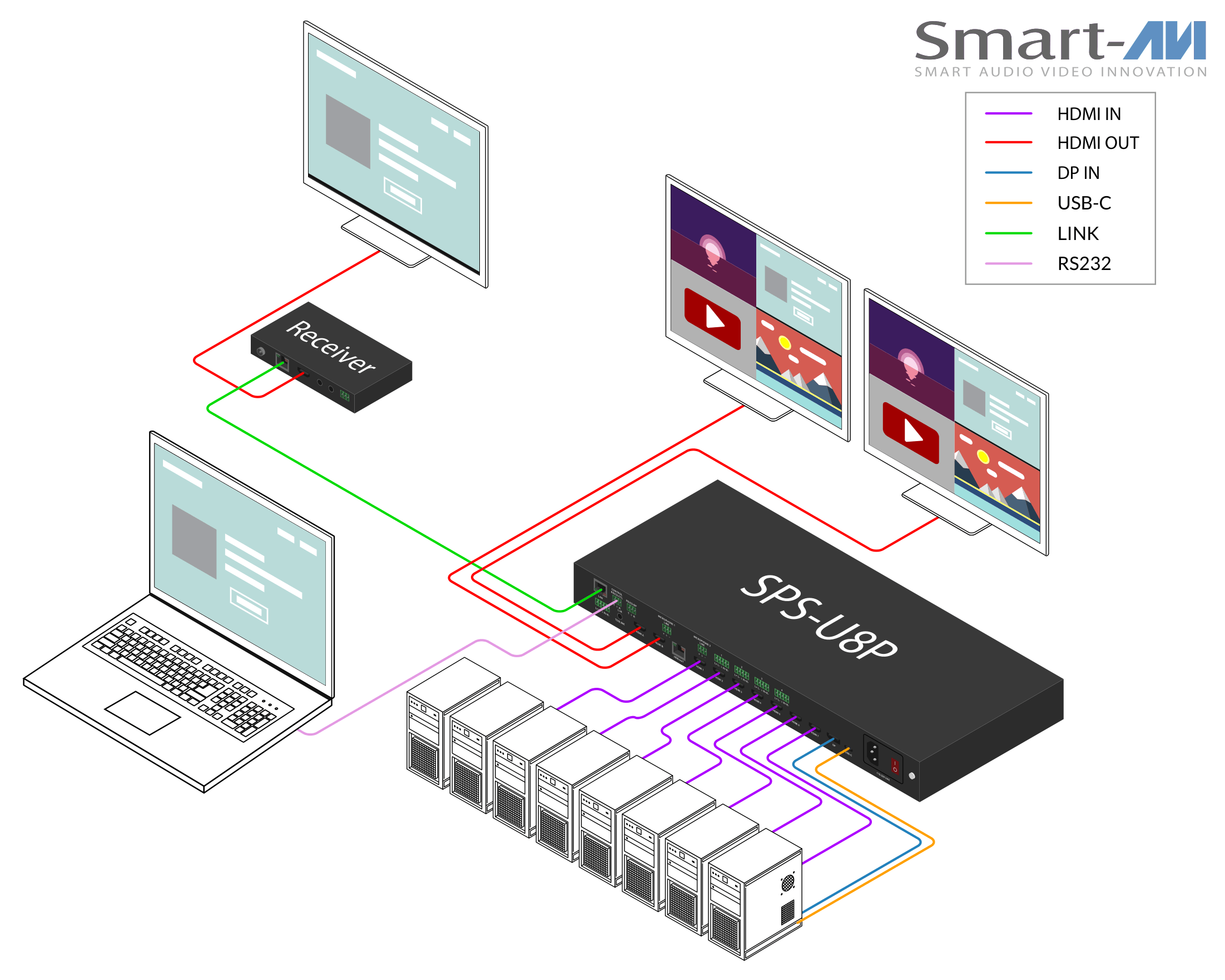 The SPS-U8P is a 8-input presentation switcher built for presentation and conference room systems that require simple source selection and multi-source display. It supports HDMI, DisplayPort, and USB-C inputs, allowing users to connect laptops, desktop computers, and other AV devices and display them on a single screen.